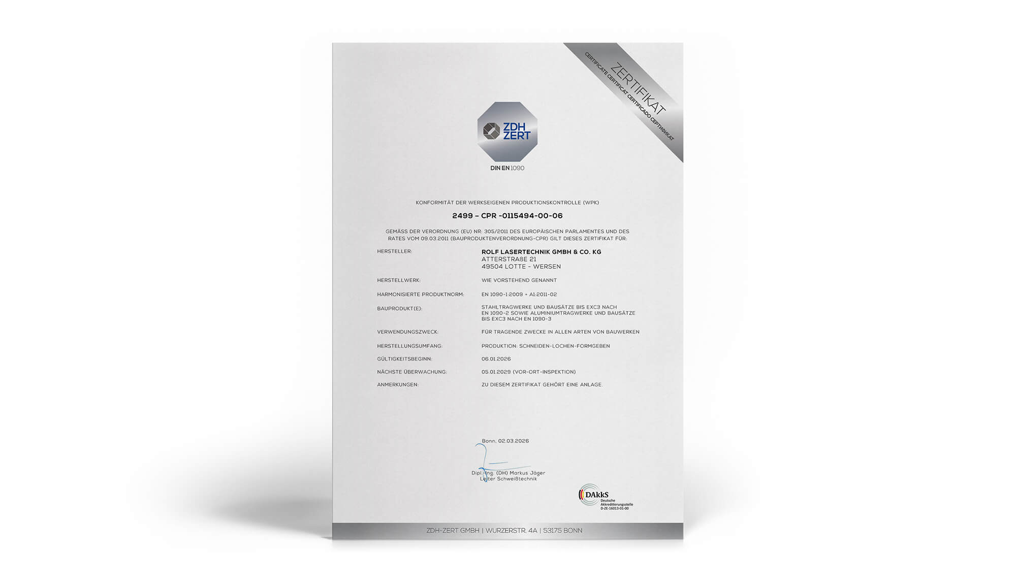 Seit dem 6. Januar 2016 ist die Firma Rolf Lasertechnik GmbH & Co. KG berechtigt, konform mit den Anforderungen der DIN EN 1090 EXC3, Bauteile der Produktionsgruppe Schneiden-Lochen-Formgeben zu fertigen.